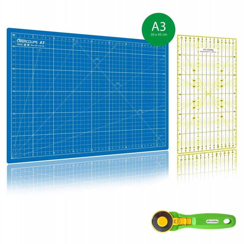 Kit de couture Tapis de découpe BLEU A3 (30x45cm), cutter rotatif 45mm et règle patchwork 15x30cm